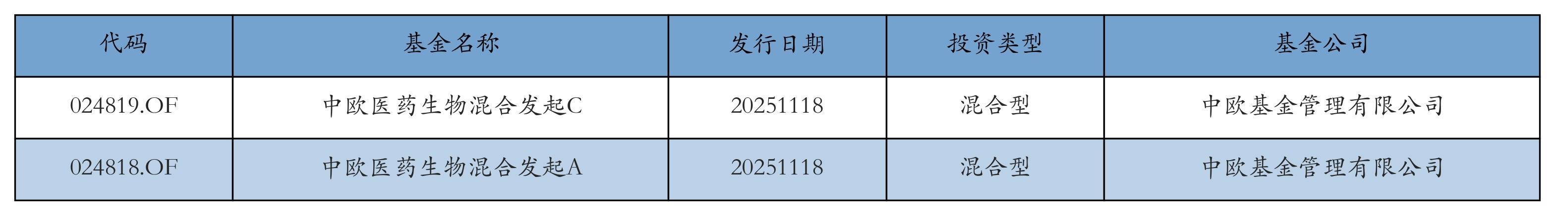 昨日有2只新基金发行,分别为:中欧医药生物混合发起C、中欧医药生物混合发起A,详情见下表: