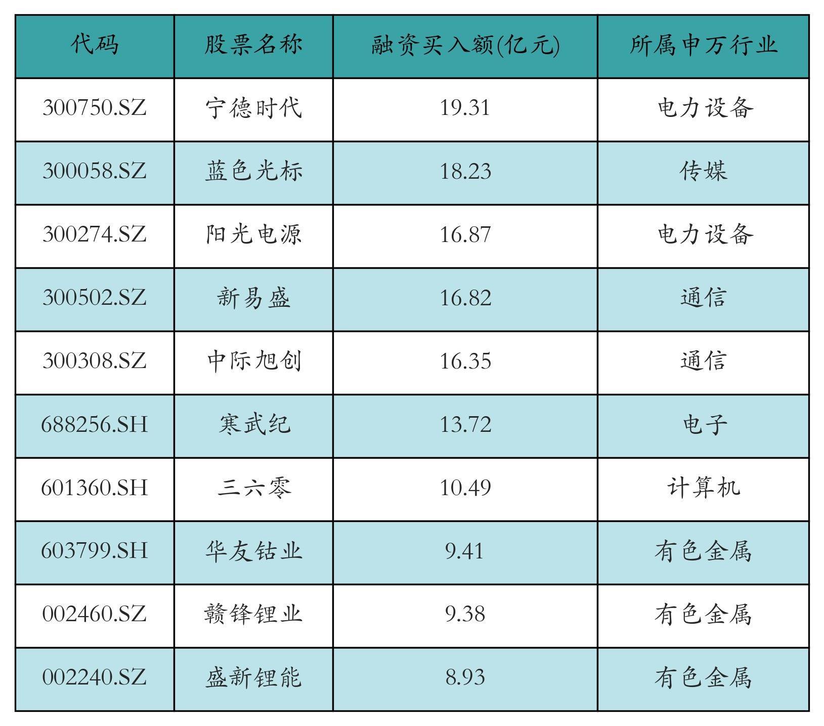 两市共有3463只个股有融资资金买入,其中宁德时代、蓝色光标、阳光电源排名前三,买入金额分别19.31亿元、18.23亿元、16.87亿元。融资买入额前10个股详情见下表: